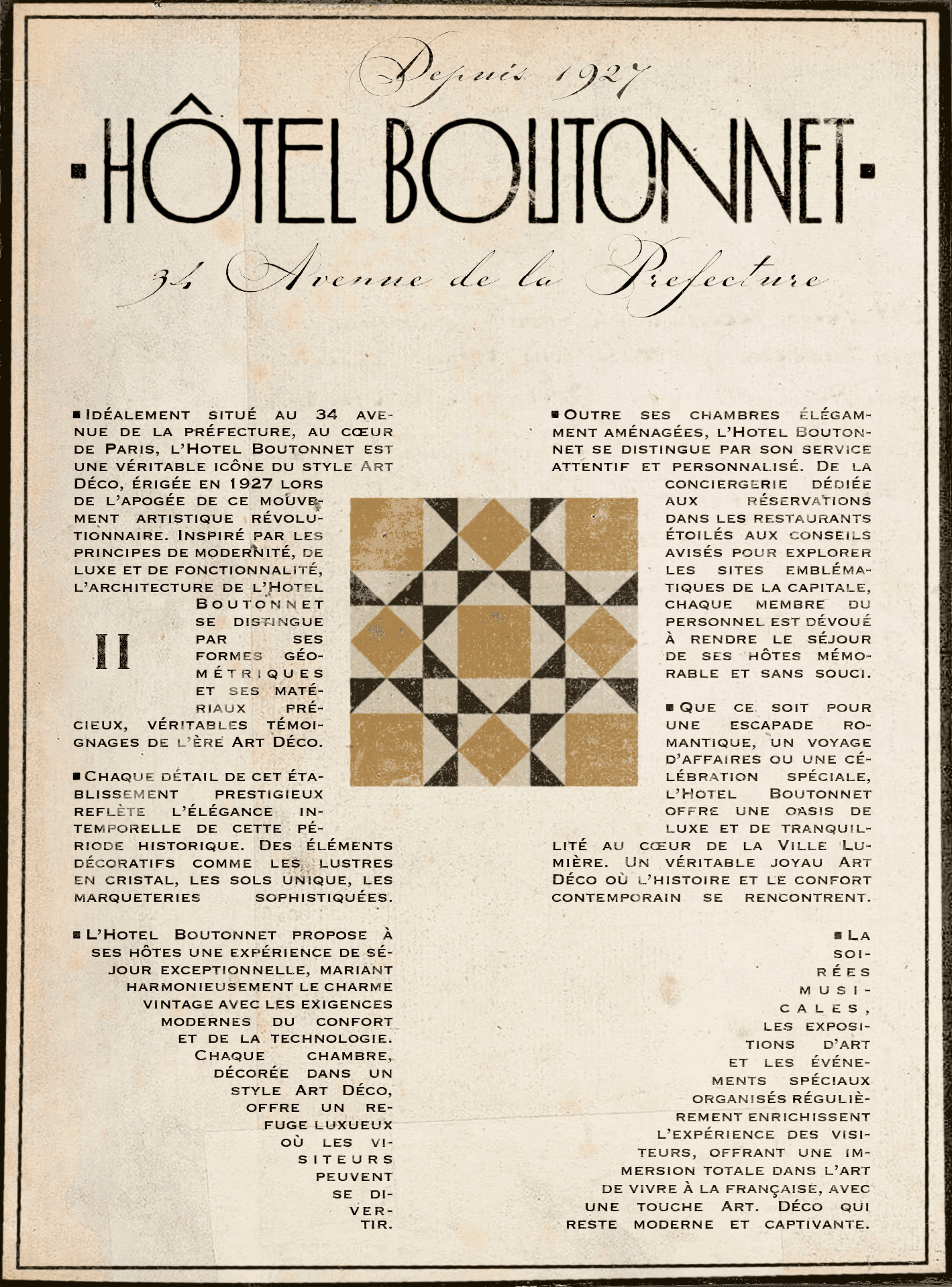 Hôtel Boutonnet is a luxury establishment situated at 34 avenue de la Préfecture in paris. Established in 1927 during the Art deco era. The hotel's architecture and ambiance are heavily influenced by this artistic movement. Its art deco style is prominently displayed through intricate floor patterns, wall decorations, and overall atmosphere.