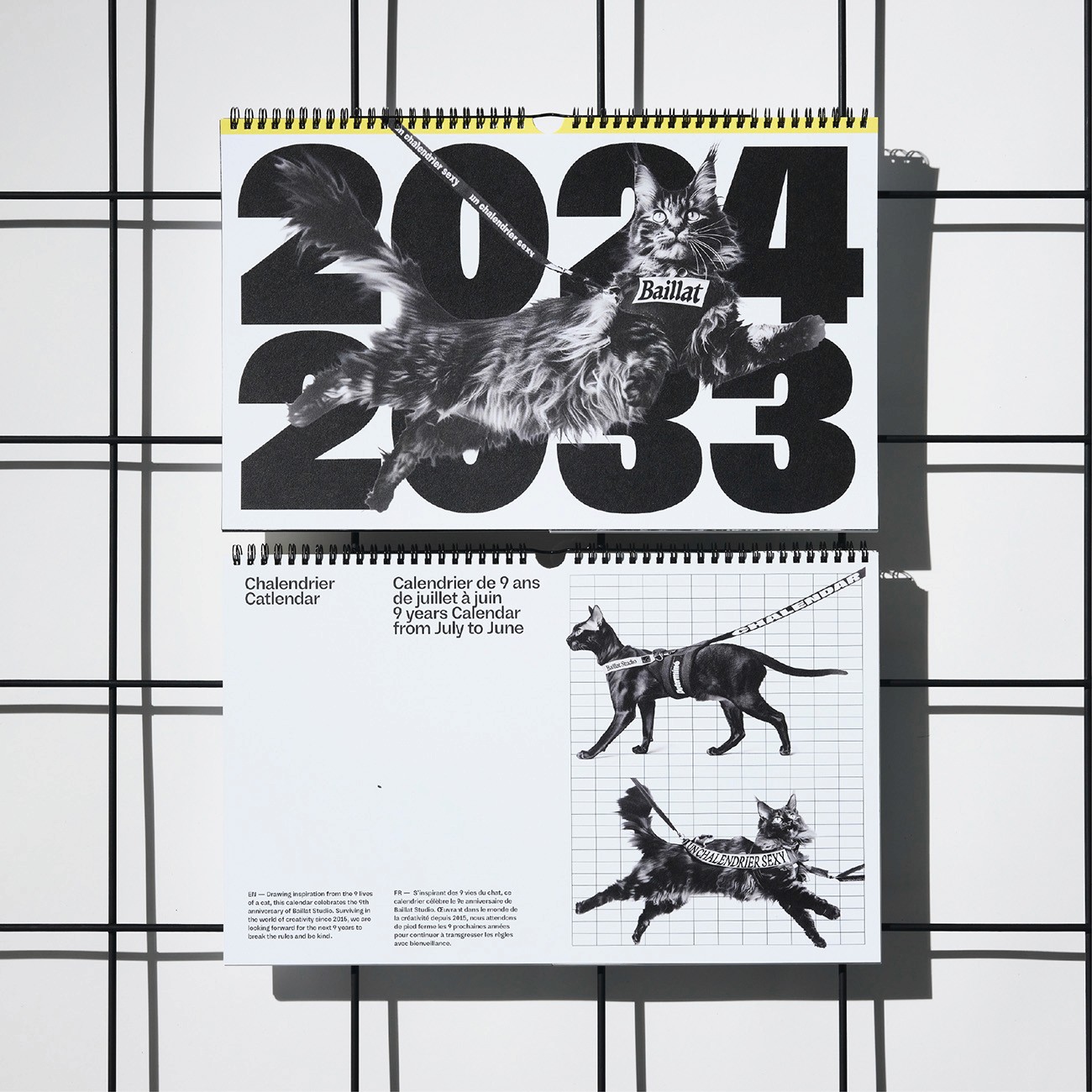 This catlendar, covering the years 2024 to 2033 from June to July, invites you to explore a radiant universe. Comprising 29 pages, each year is accompanied by unique artwork, a featured month, and a flap reminiscent of the period, partially created using artificial intelligence to produce a range of realistic and abstract cat images.